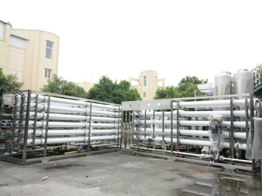原水→增壓泵(一用一備)→砂過濾器→炭過濾器→硬化器(根據地區不合選用)→精密過濾器→兩頭水箱→RO前水泵→精密過濾器→RO高壓泵→RO反滲透零碎→RO水箱